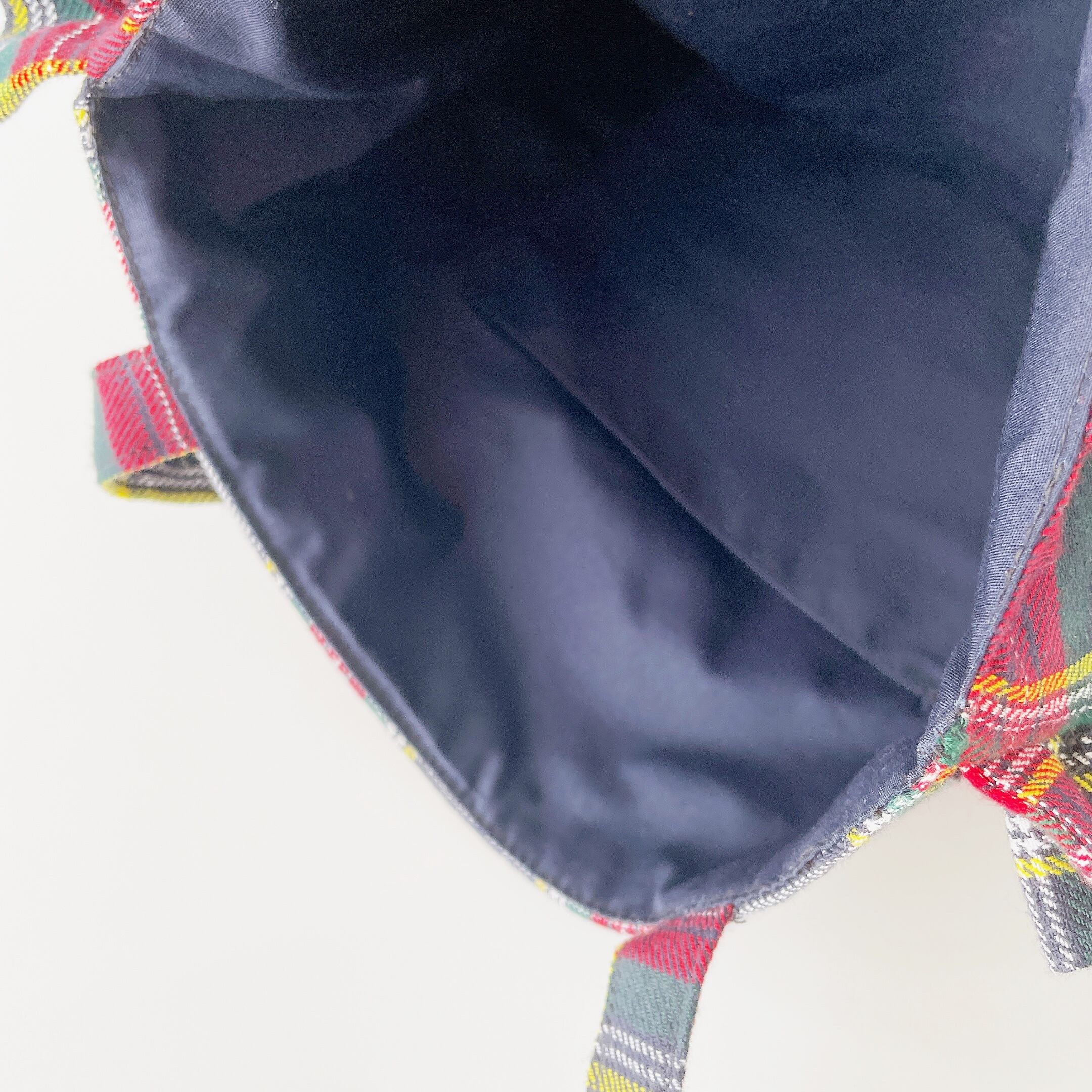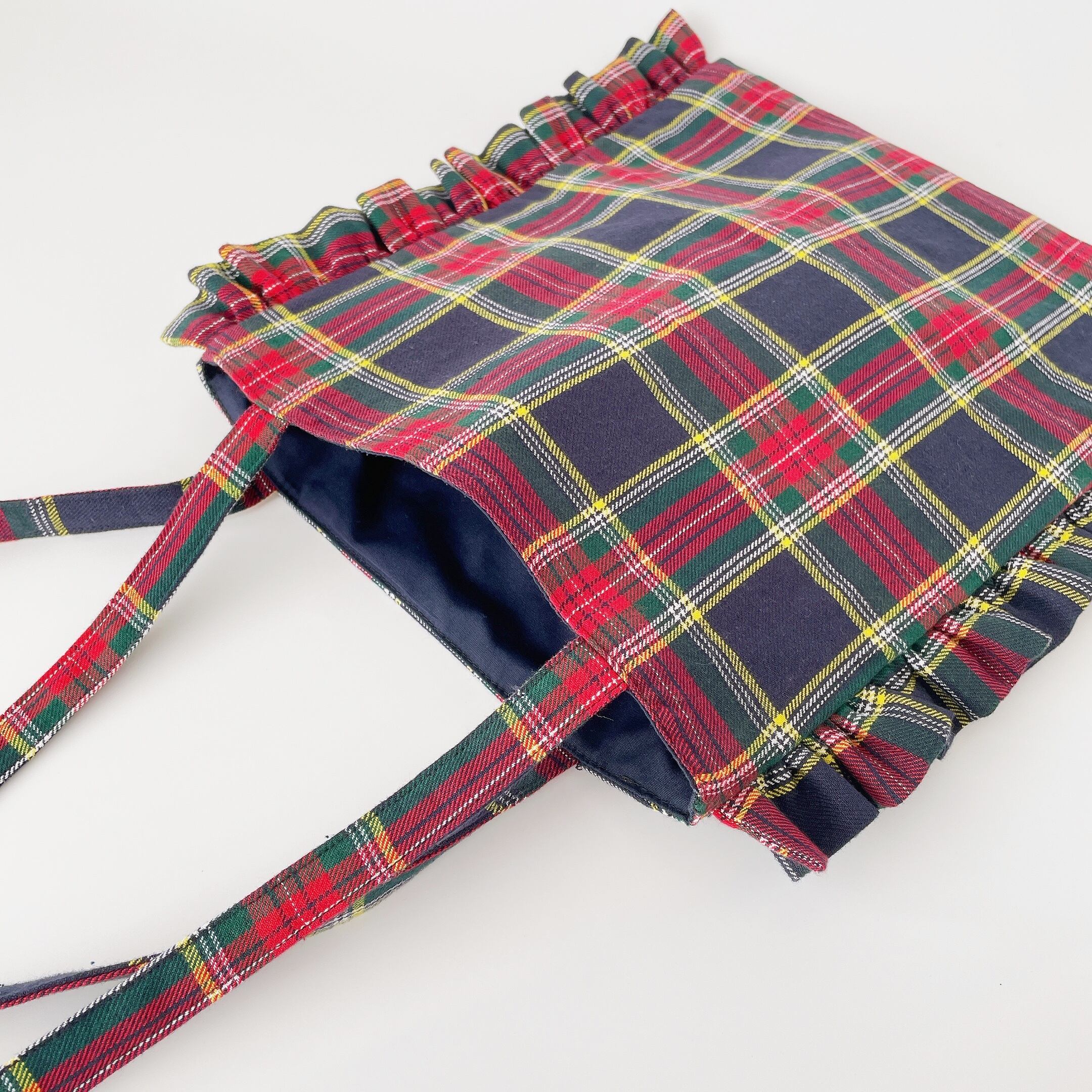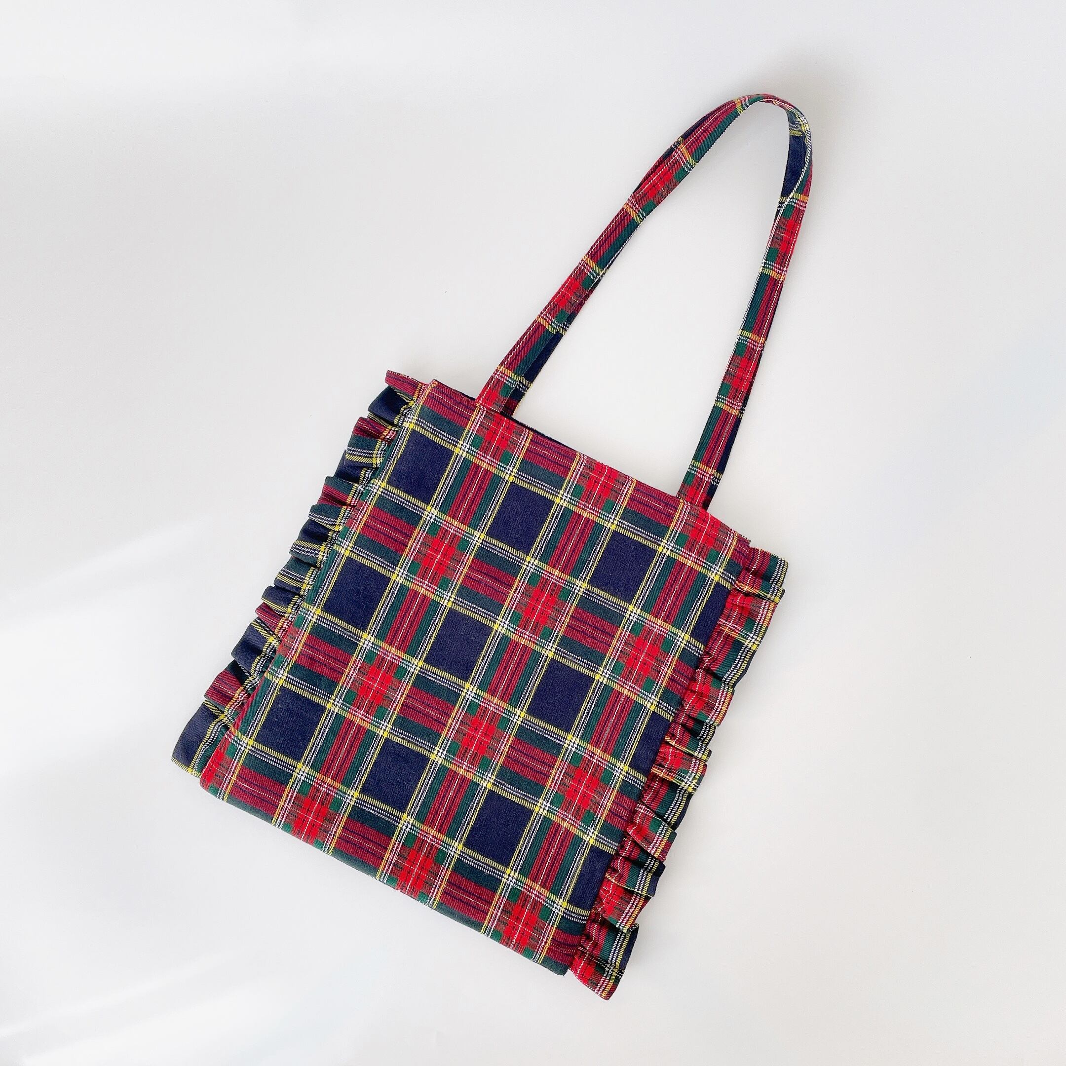 赤のタータンチェックがかわいいフリルトートバッグです。内ポケット1つ付き。