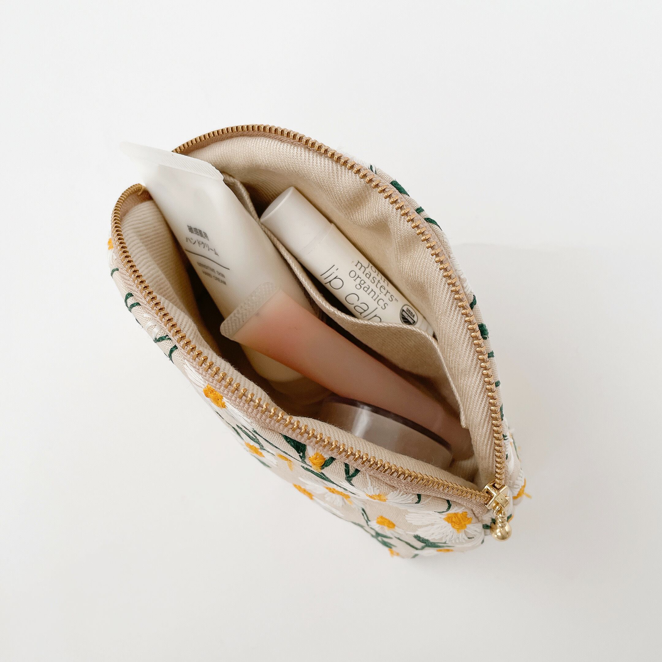まる口ポーチ【L】(デイジー刺繍 ベージュ)